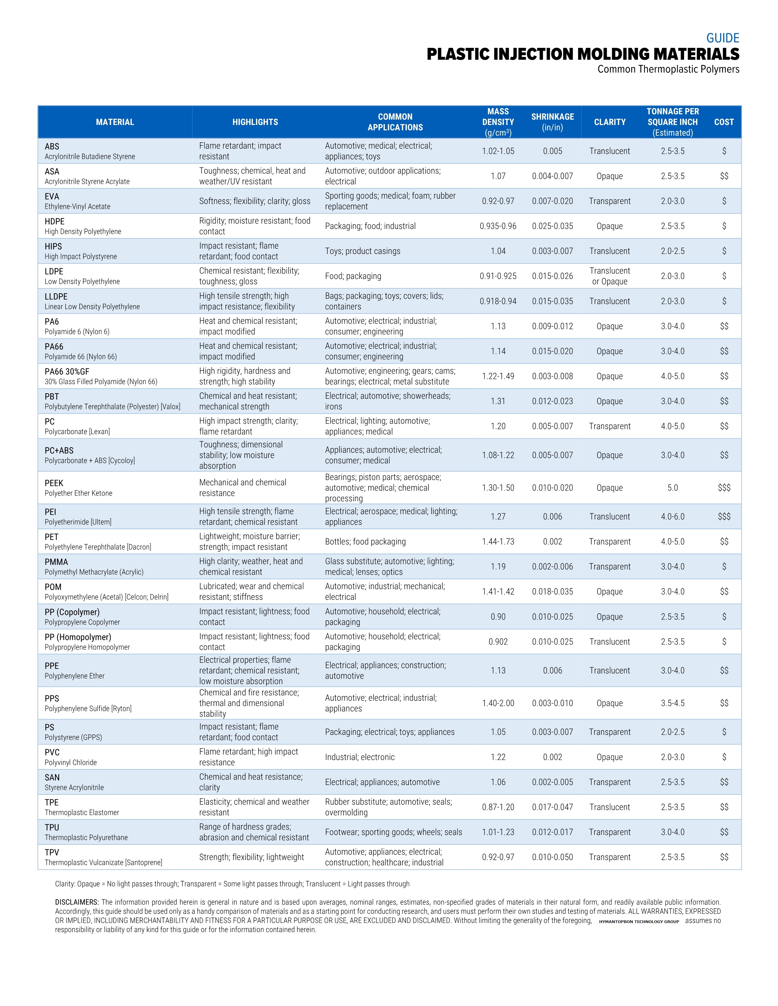 PLASTIC INJECTION MOLDING MATERIALS CHART