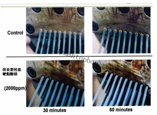 3.改良型羥基硬脂酸鎂不會析出: - 由于改良型羥基硬脂酸鎂具有的橋梁作用,使到改良型羥基硬脂酸鎂與樹脂,以及無機填充物,添加劑,色粉形成一個整體